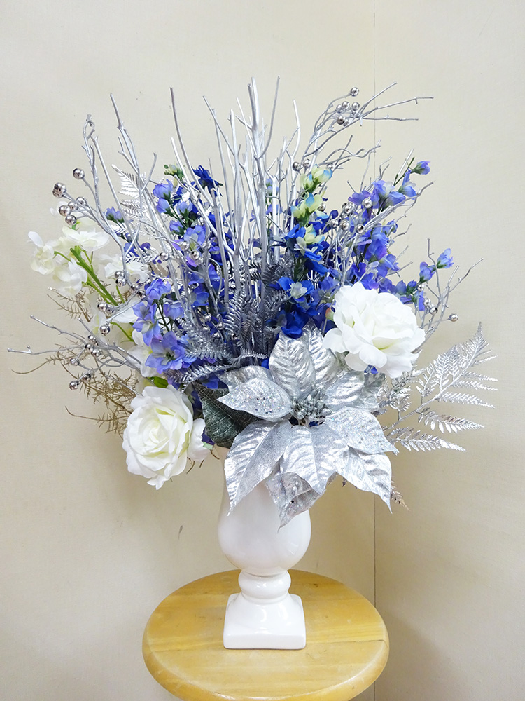 デルフィニウム、ポインセチア、白バラ、シルバーリーフ、三又(シルバー)