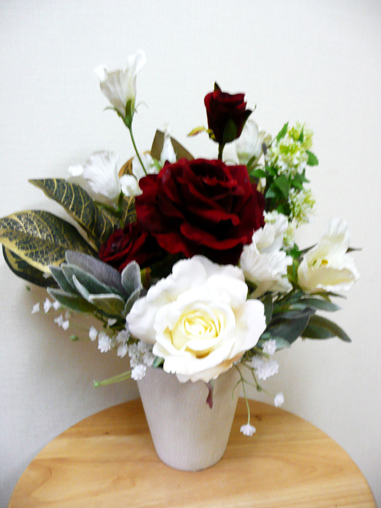 赤バラ、白バラ、マグノリアリーフ