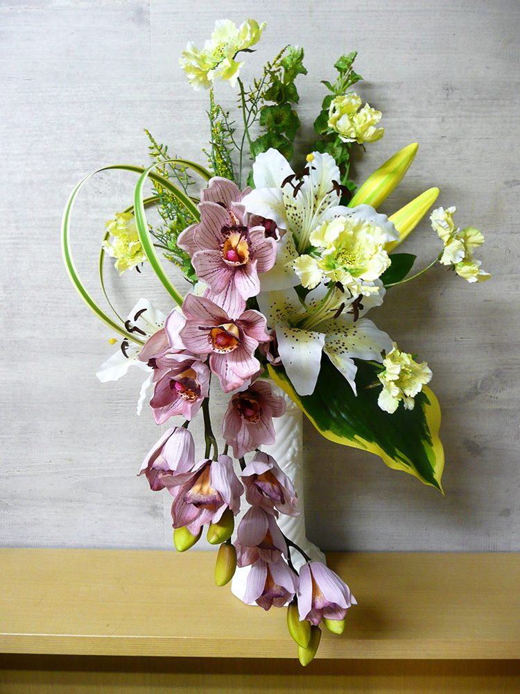 シンビジューム、スカビオサ、ユリ、シングルリーフ