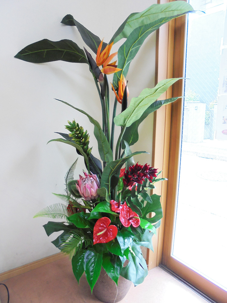 作品番号OBJ-1053 設置場所 サイズ(花器含む) オブジェ・大型 主な花材 ダリア、ジンジャー、プロテア、アンスリューム、ストレチア、モンステラ ※アレンジはすべてスタジオ理佳オリジナルデザインです。