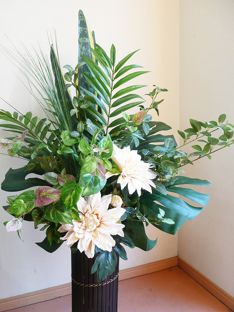 作品番号OBJ-1055 設置場所 サイズ(花器含む) オブジェ・大型 主な花材 ダリア、モンステラ、パームリーフ、サンセベリア、ベアグラス、フィットニア ※アレンジはすべてスタジオ理佳オリジナルデザインです。