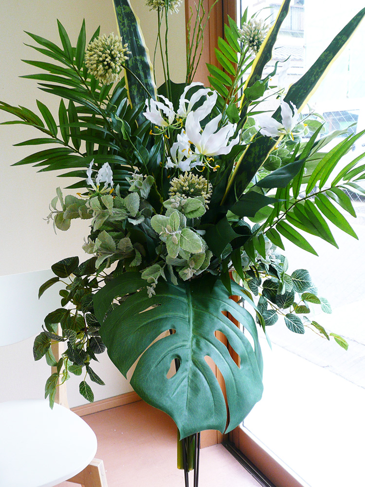 作品番号OBJ-1060 設置場所 サイズ(花器含む) 床置き 高さ145cm程度 主な花材 グロリオサ、アリウム、モンステラ、パームリーフ、サンセベリア、フィットニア ※アレンジはすべてスタジオ理佳オリジナルデザインです。