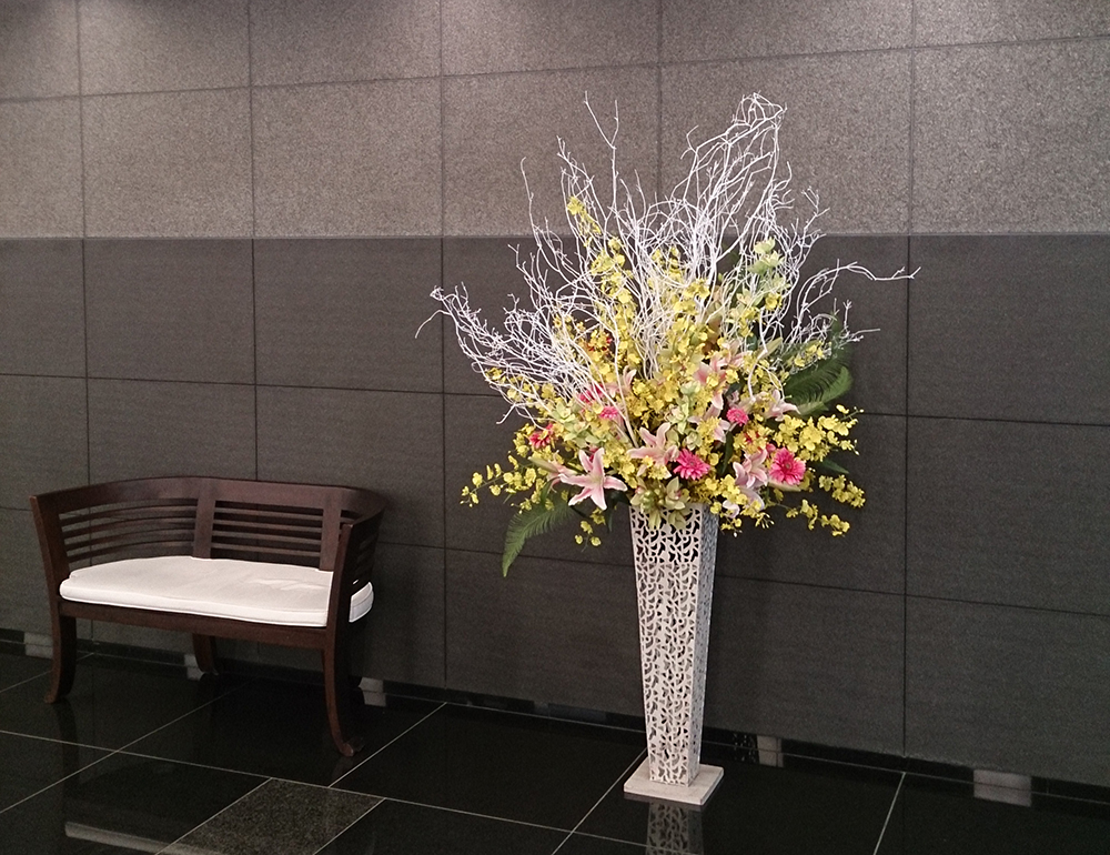 作品番号SET-130 設置場所 ビル エントランス サイズ(花器含む) オブジェ・大型 高さ2m程度 主な花材 オンシジューム、ユリ、ガーベラ、白枝 ※アレンジはすべてスタジオ理佳オリジナルデザインです。
