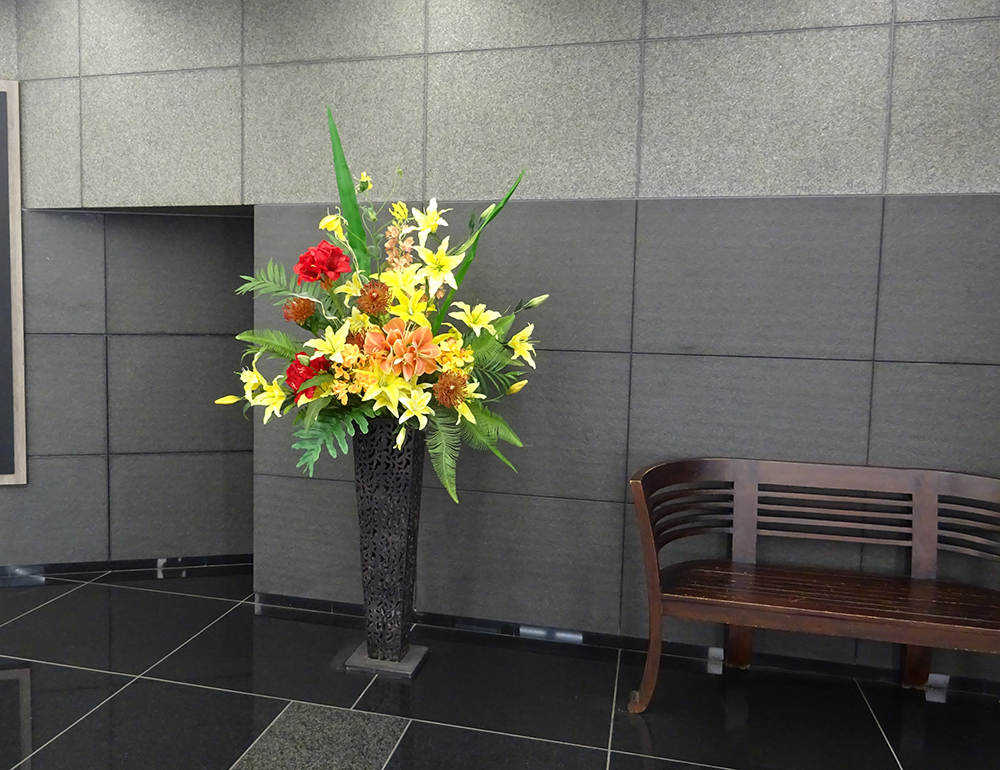 作品番号SET-134 設置場所 ビル エントランス サイズ(花器含む) オブジェ・大型 高さ2m程度 主な花材 ユリ、アマリリス、ピンクッション、アルストロメリア、セローム、パームリーフ、シダ ※アレンジはすべてスタジオ理佳オリジナルデザインです。