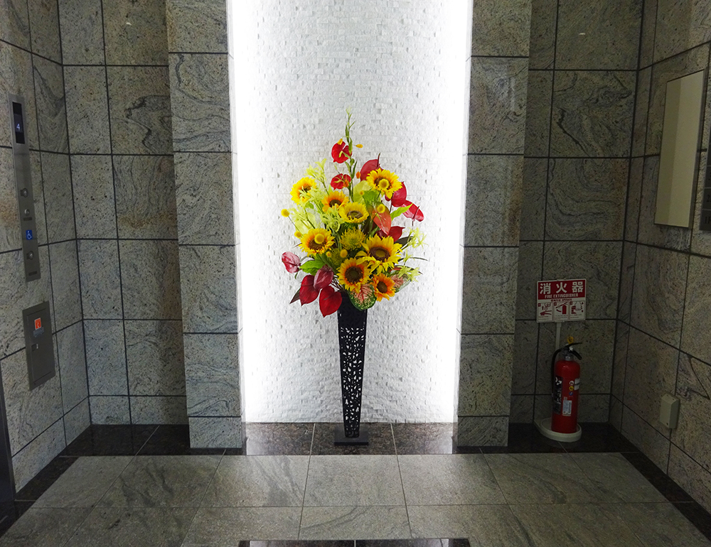 作品番号SET-159 設置場所 横浜市 ビル エントランス サイズ(花器含む) オブジェ・大型 高さ160cm程度 主な花材 ひまわり、アンスリウム、サンダーソニア、ネリネリリィ ※アレンジはすべてスタジオ理佳オリジナルデザインです。