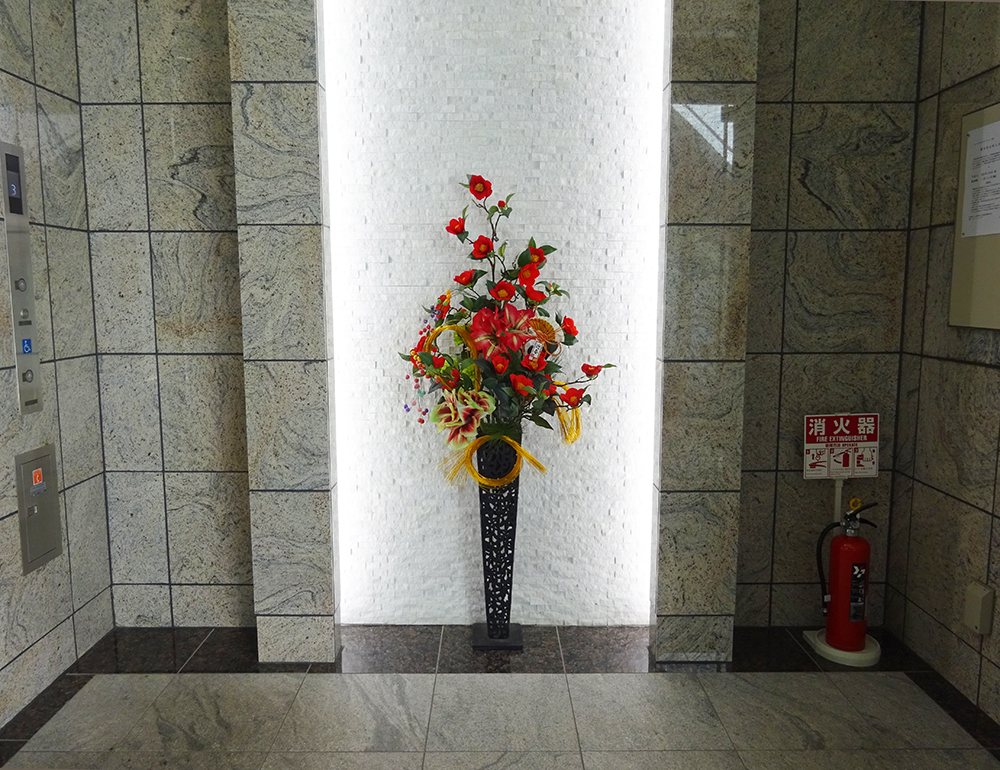 作品番号SET-160 設置場所 横浜市 ビル エントランス サイズ(花器含む) オブジェ・大型 高さ160cm程度 主な花材 椿、アマリリス、舞玉、水引、お正月飾り ※アレンジはすべてスタジオ理佳オリジナルデザインです。