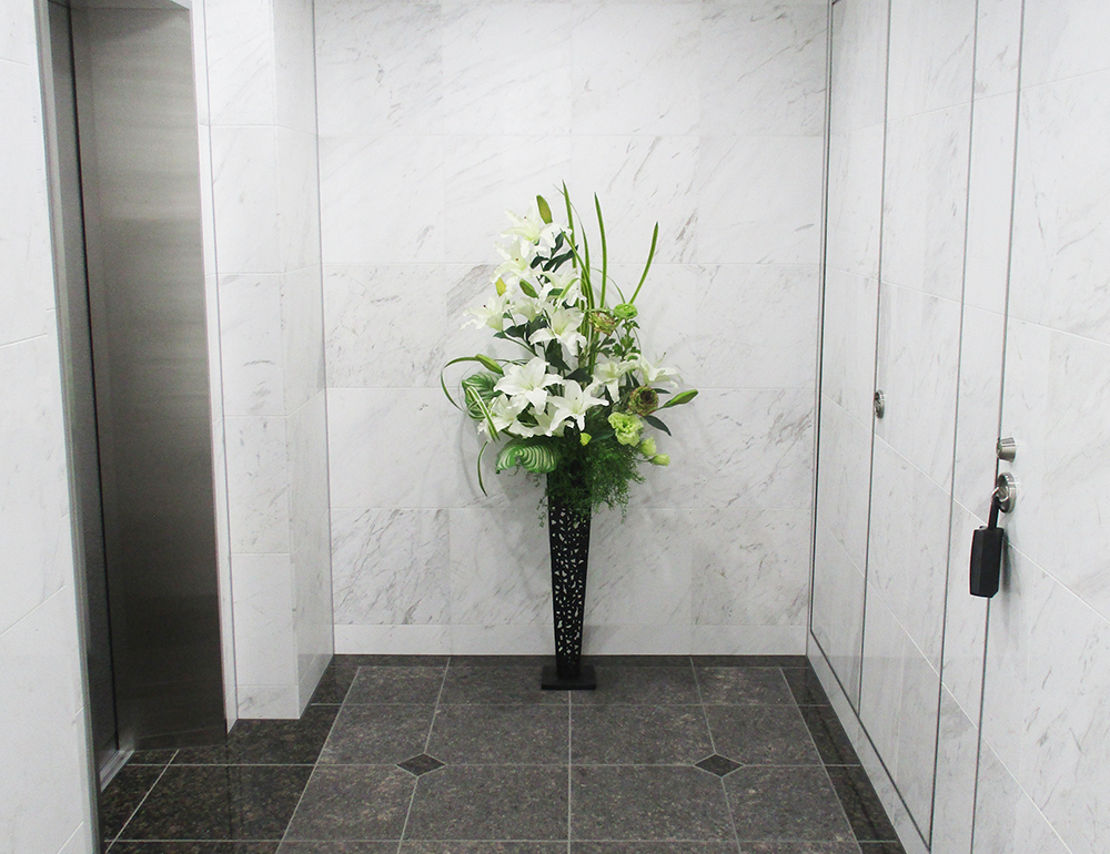 作品番号SET-162 設置場所 横浜市 マンション エントランス サイズ(花器含む) オブジェ・大型 高さ160cm程度 主な花材 ユリ、ラナンキュラス、シングルリーフ、カラテアリーフ ※アレンジはすべてスタジオ理佳オリジナルデザインです。