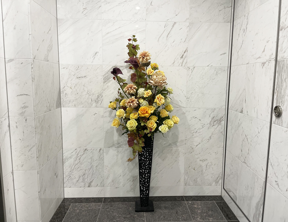 作品番号SET-165 設置場所 横浜市 マンション エントランス サイズ(花器含む) オブジェ・大型 高さ160cm程度 主な花材 バラ、カラー、ダリア、ピオニー、スノーボール、グレープリーフ ※アレンジはすべてスタジオ理佳オリジナルデザインです。