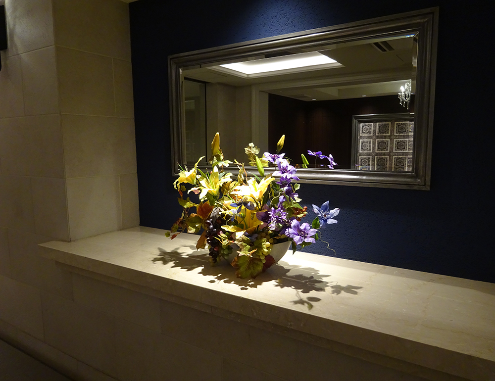 作品番号SET-167 設置場所 千葉県 マンション エントランス サイズ(花器含む) LLサイズ 主な花材 ユリ、クレマチス、ぶどう、グレープリーフ ※アレンジはすべてスタジオ理佳オリジナルデザインです。
