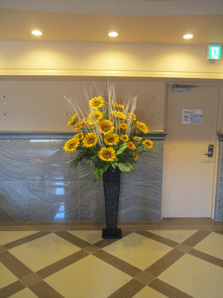 作品番号SET-176 設置場所 ビル エントランス サイズ(花器含む) オブジェ・大型 高さ2m程度 主な花材 ひまわり、白枝、カラテアリーフ、パームリーフ、カラーリーフ ※アレンジはすべてスタジオ理佳オリジナルデザインです。