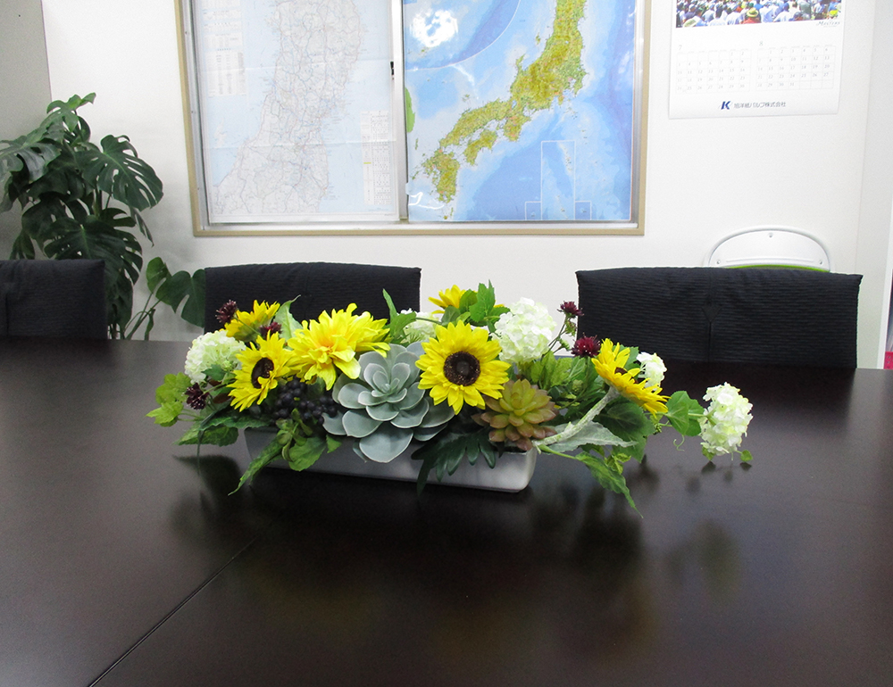 作品番号SET-193 設置場所 オフィス 会議室 サイズ(花器含む) Mサイズ 主な花材 ヒマワリ、スノーボール、ダリア、エケベリア、ブルーベリー ※アレンジはすべてスタジオ理佳オリジナルデザインです。