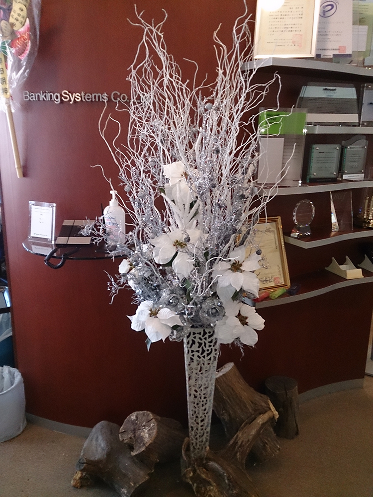 作品番号SET-212 設置場所 オフィス エントランス サイズ(花器含む) オブジェ・大型 高さ2m程度 主な花材 ポインセチア、メタリックローズ、白枝、クリスマスコーンブランチ、流木 ※アレンジはすべてスタジオ理佳オリジナルデザインです。