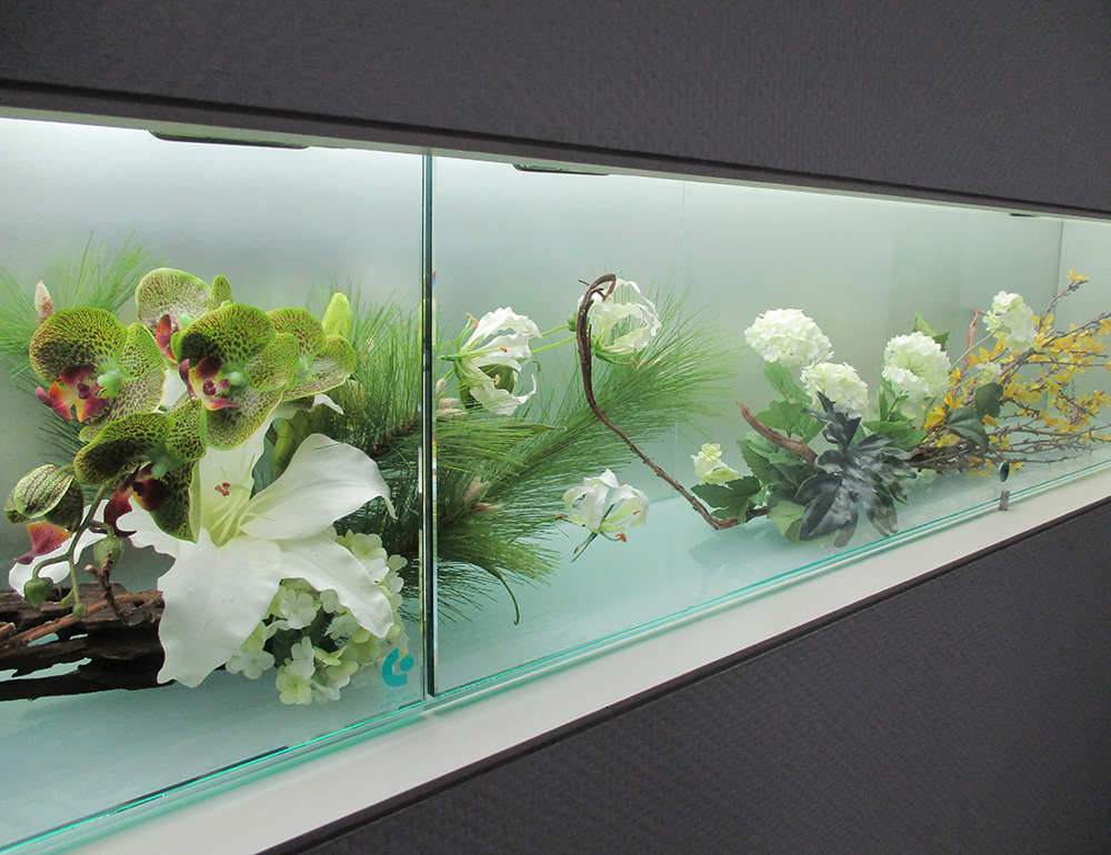 作品番号SET-224 設置場所 オフィス ウィンドウディスプレイ サイズ(花器含む) オブジェ・大型 主な花材 カサブランカ、コチョウラン、レンギョウ、スノーボール、グロリオサ、流木 ※アレンジはすべてスタジオ理佳オリジナルデザインです。