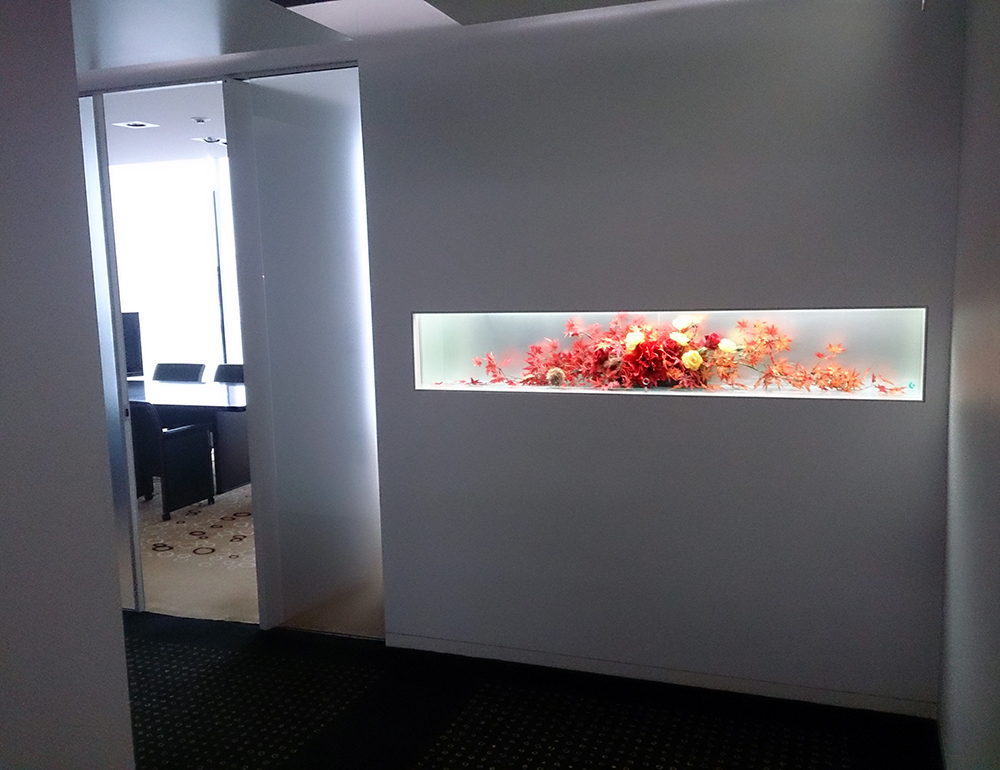作品番号SET-231 設置場所 オフィス ウィンドウディスプレイ サイズ(花器含む) オブジェ・大型 ディスプレイ横幅180cm 主な花材 紅葉、栗、バラ ※アレンジはすべてスタジオ理佳オリジナルデザインです。