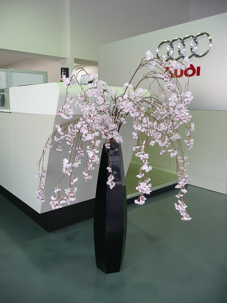 作品番号SET-244 設置場所 アウディジャパン販売(株)Audi旗の台 ショールーム サイズ(花器含む) LLサイズ 床置き 高さ130cm程度 主な花材 枝垂桜 ※アレンジはすべてスタジオ理佳オリジナルデザインです。