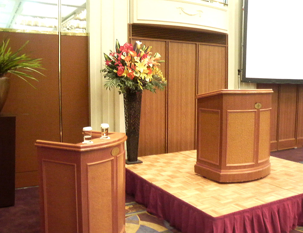 作品番号SET-263 設置場所 株主総会 壇上花 サイズ(花器含む) オブジェ・大型 高さ180cm程度 主な花材 ユリ、カラー、ドラセナ、パームリーフ ※アレンジはすべてスタジオ理佳オリジナルデザインです。