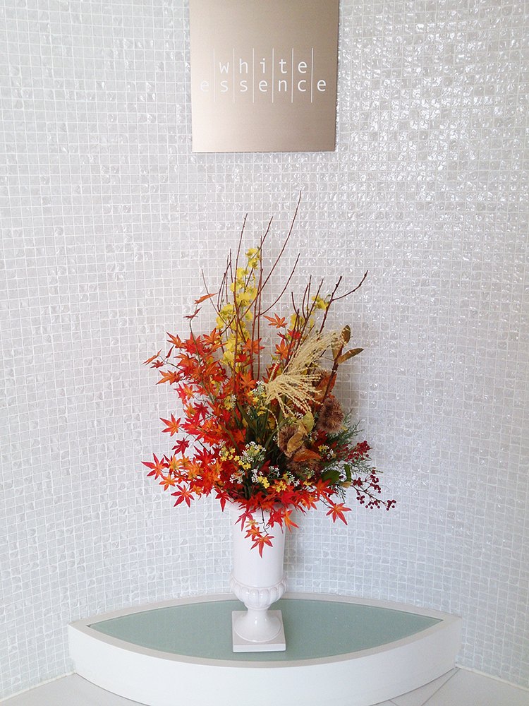 作品番号SET-271 設置場所 ホワイトエッセンスJOYデンタルクリニック サイズ(花器含む) 床置き 高さ130cm程度 主な花材 もみじ、ススキ、オンシジューム、栗 ※アレンジはすべてスタジオ理佳オリジナルデザインです。