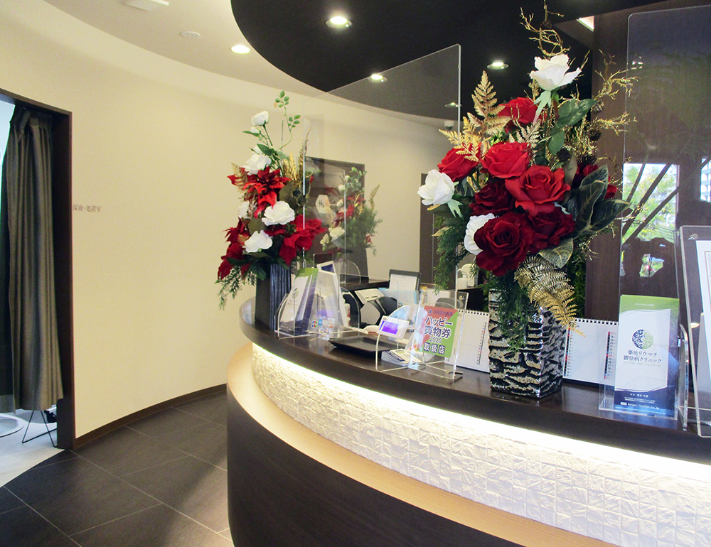 作品番号SET-293 設置場所 中央区 クリニック 受付カウンター サイズ(花器含む) Lサイズ 主な花材 ポインセチア、バラ、クリスマスコーンブランチ、ゴールドファーン ※アレンジはすべてスタジオ理佳オリジナルデザインです。