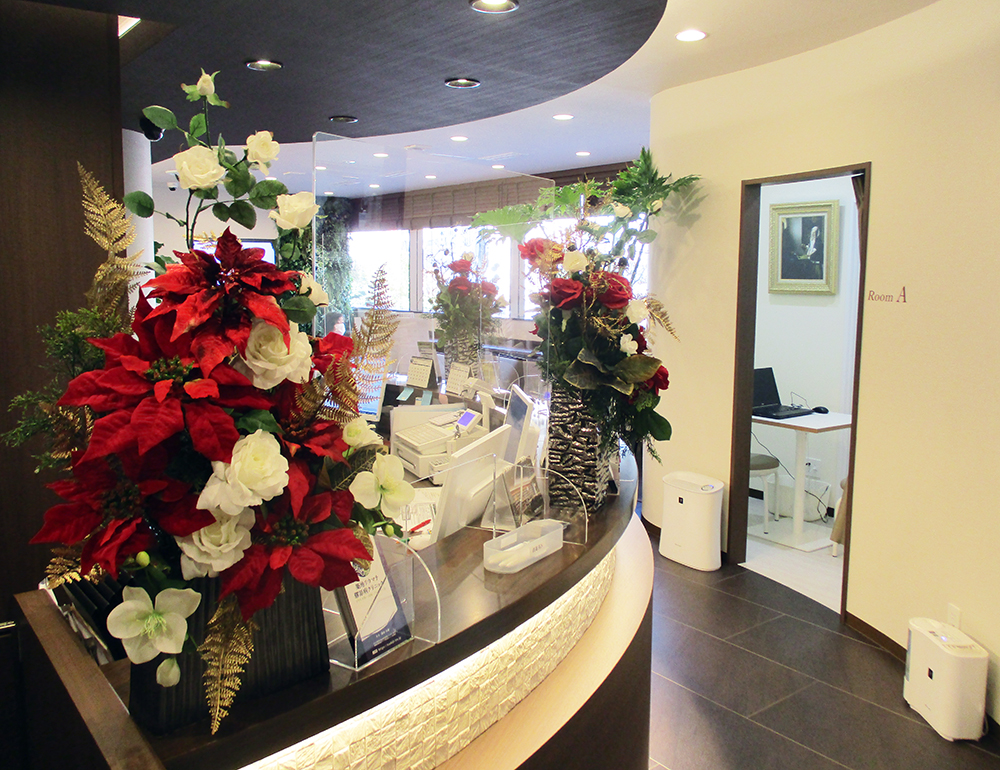 作品番号SET-294 設置場所 中央区 クリニック 受付カウンター サイズ(花器含む) Lサイズ 主な花材 ポインセチア、バラ、クリスマスコーンブランチ、ゴールドファーン ※アレンジはすべてスタジオ理佳オリジナルデザインです。