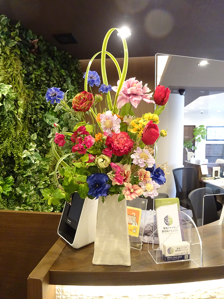 作品番号SET-295 設置場所 中央区 クリニック 受付カウンター サイズ(花器含む) Lサイズ 主な花材 チューリップ、アネモネ、スカビオサ、スイトピー、シングルリーフ、ミント ※アレンジはすべてスタジオ理佳オリジナルデザインです。