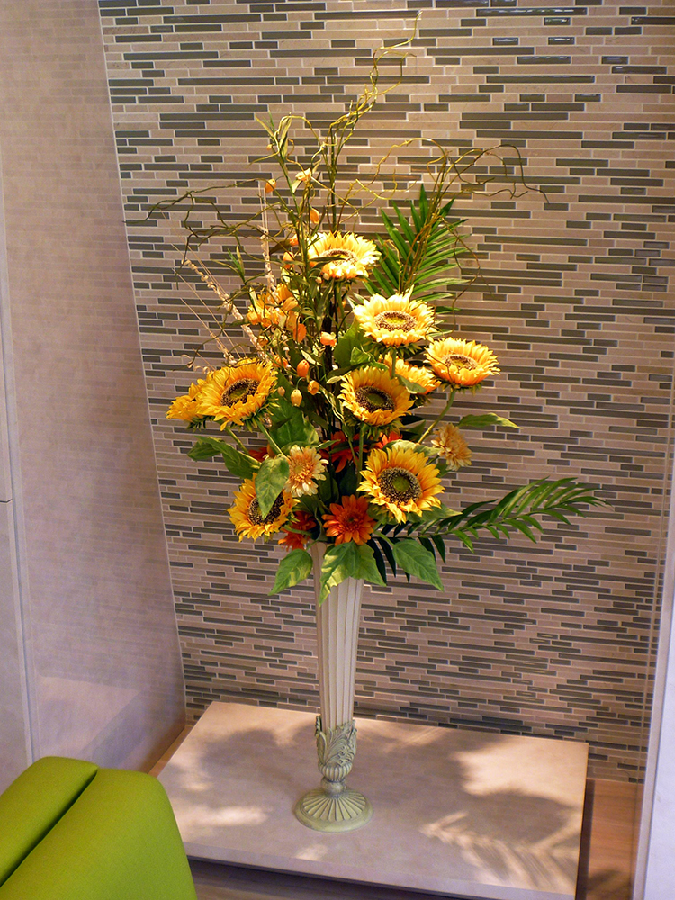 作品番号SET-296 設置場所 都内 クリニック サイズ(花器含む) 床置き 高さ145cm程度 主な花材 ヒマワリ、ガーベラ、サンダーソニア、パームリーフ ※アレンジはすべてスタジオ理佳オリジナルデザインです。