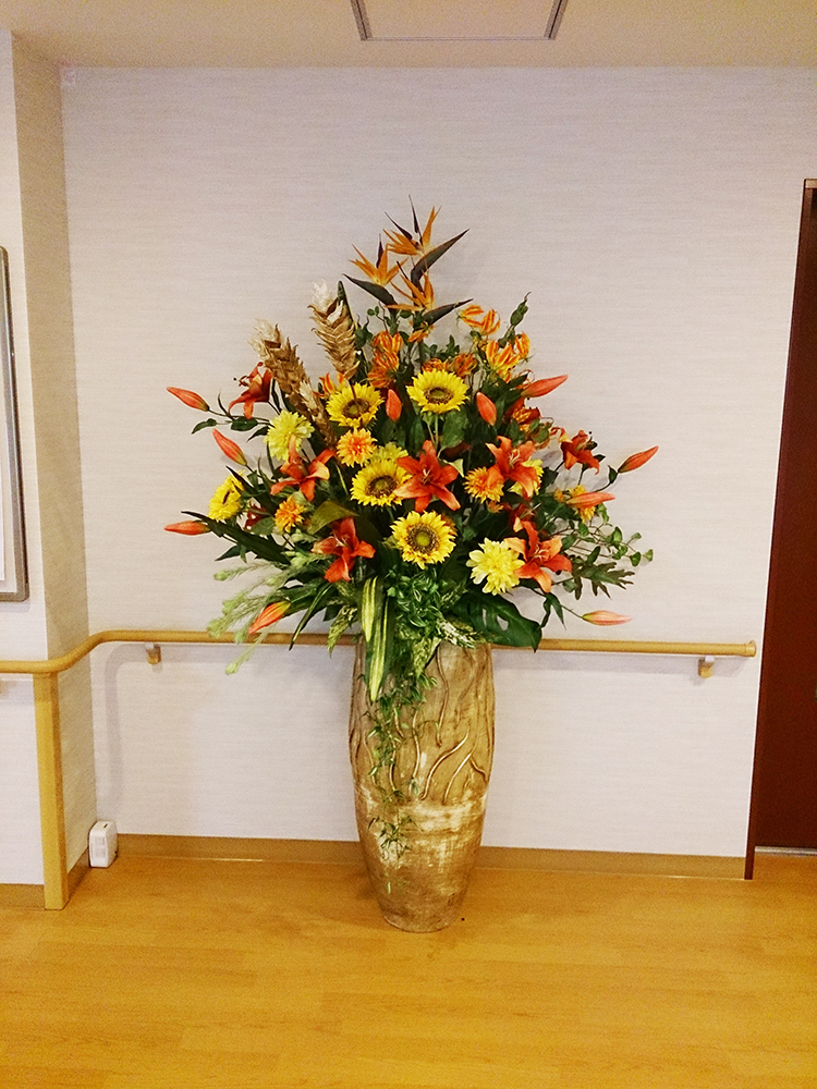 作品番号SET-318 設置場所 高齢者施設 サイズ(花器含む) オブジェ・大型 高さ180cm程度 主な花材 ヒマワリ、ユリ、ストレチア、グロリオサ、ドライジンジャー、モンステラ ※アレンジはすべてスタジオ理佳オリジナルデザインです。