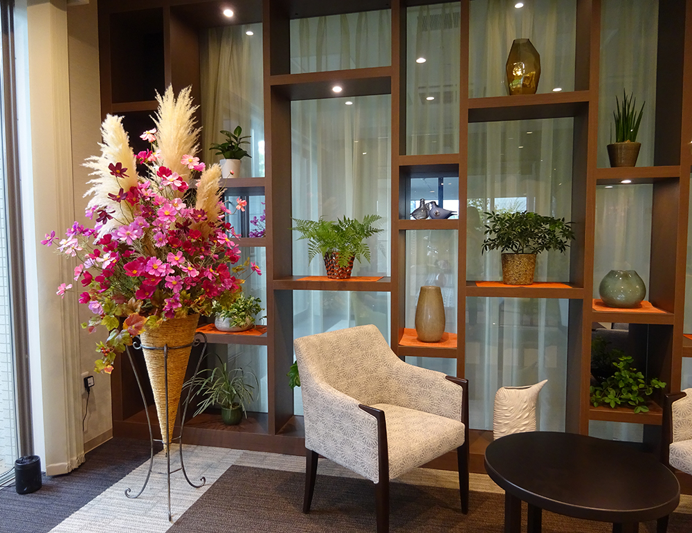 作品番号SET-320 設置場所 世田谷区 高齢者施設 エントランス サイズ(花器含む) オブジェ・大型 高さ190cm程度 主な花材 コスモス、パンパスグラス ※アレンジはすべてスタジオ理佳オリジナルデザインです。