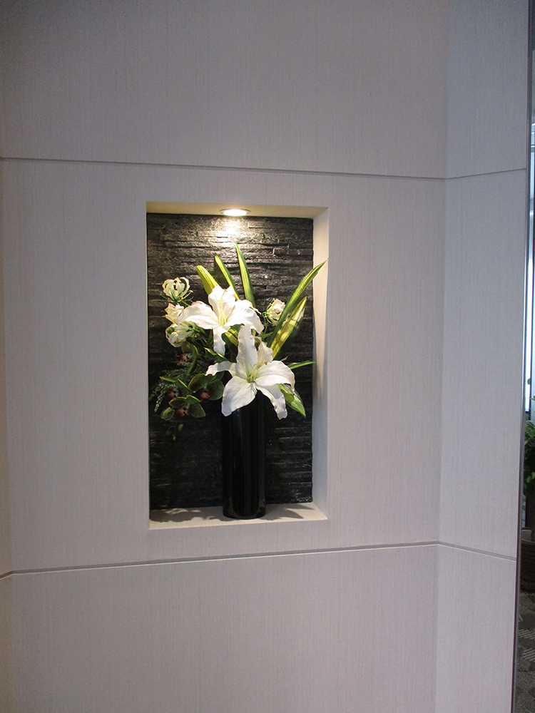 作品番号SET-326 設置場所 中央区 美容クリニック エントランス サイズ(花器含む) Mサイズ 主な花材 カサブランカ、コチョウラン、グロリオサ、ドラセナ ※アレンジはすべてスタジオ理佳オリジナルデザインです。