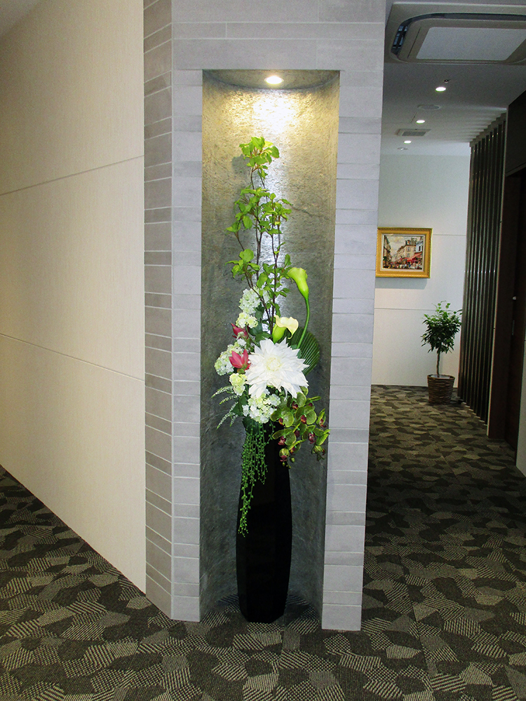 作品番号SET-330 設置場所 中央区 美容クリニック エントランス サイズ(花器含む) 床置き 高さ180cm程度 主な花材 ダリア、カラー、コチョウラン、アジサイ、マルハウチワヤシ ※アレンジはすべてスタジオ理佳オリジナルデザインです。