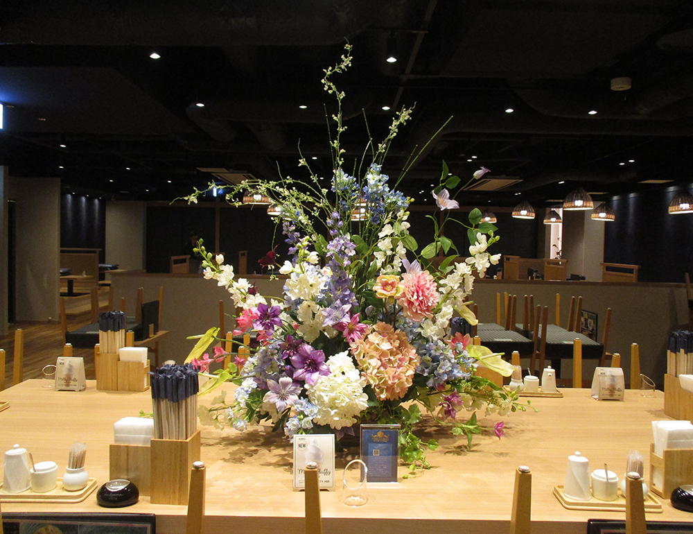 作品番号SET-352 設置場所 新宿 和食レストラン サイズ(花器含む) オブジェ・大型 高さ100cm程度 主な花材 紫陽花、鉄扇、デルフィニウム、トクサ ※アレンジはすべてスタジオ理佳オリジナルデザインです。