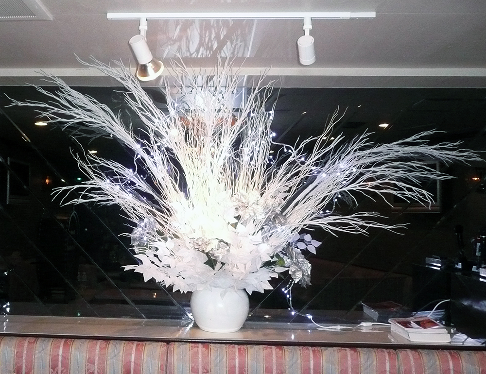 作品番号SET-356 設置場所 都内 クラブ サイズ(花器含む) オブジェ・大型 高さ130cm程度 主な花材 ポインセチア、ホワイトバーチリーフ、白枝 ※アレンジはすべてスタジオ理佳オリジナルデザインです。