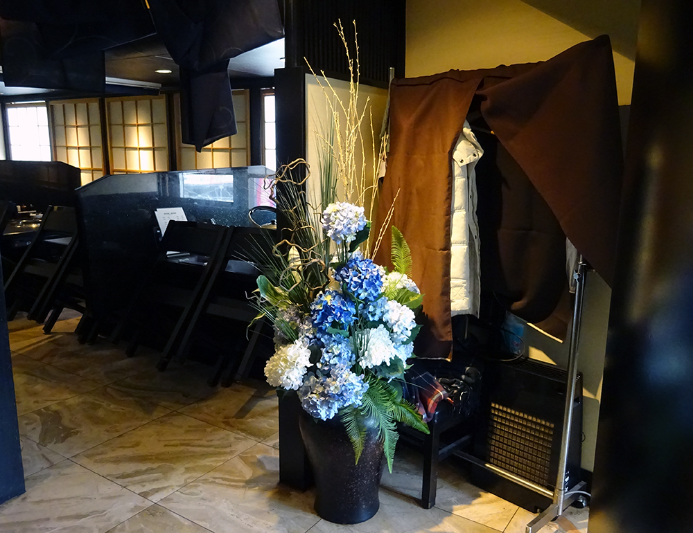 作品番号SET-359 設置場所 新宿 やきにく亭 六歌仙 サイズ(花器含む) オブジェ・大型 高さ180cm程度 主な花材 アジサイ、ベアグラス、ツイッグ、シダ ※アレンジはすべてスタジオ理佳オリジナルデザインです。