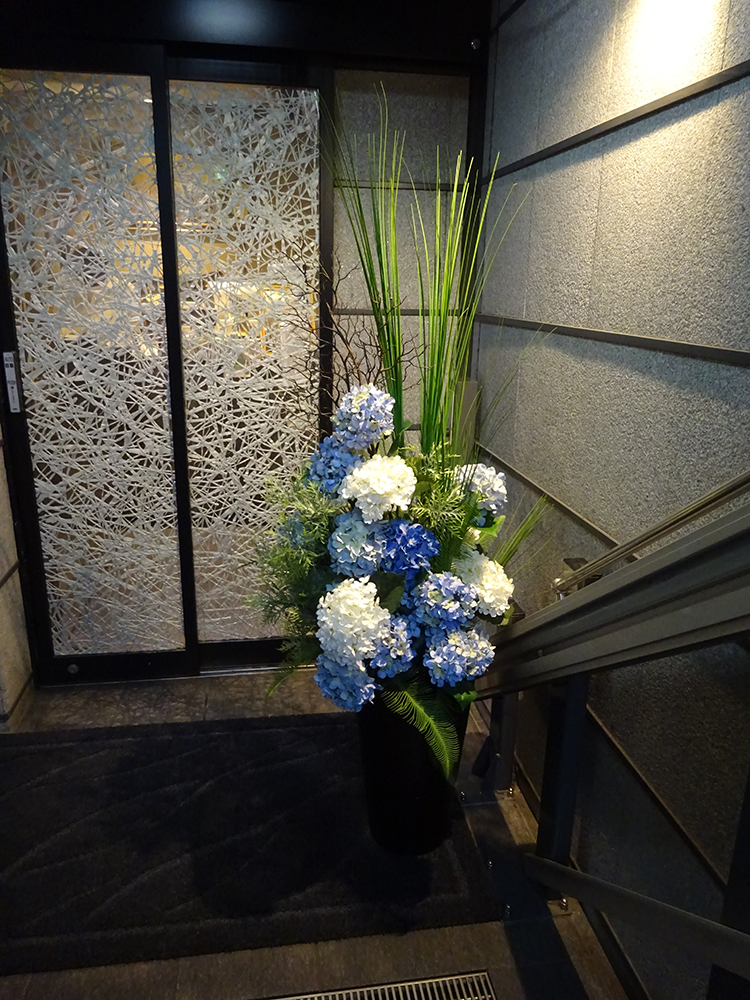 作品番号SET-361 設置場所 新宿 やきにく亭 六歌仙 サイズ(花器含む) オブジェ・大型 高さ180cm程度 主な花材 アジサイ、ベアグラス、ツイッグ ※アレンジはすべてスタジオ理佳オリジナルデザインです。