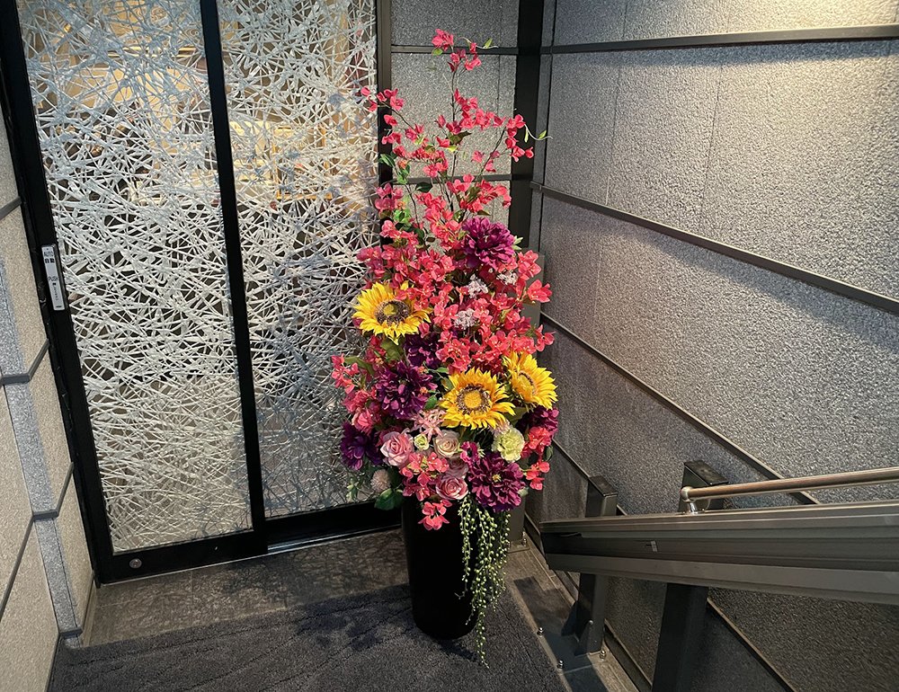 作品番号SET-363 設置場所 新宿 やきにく亭 六歌仙 サイズ(花器含む) オブジェ・大型 高さ180cm程度 主な花材 ブーゲンビリア、ヒマワリ、グリーンネックレス ※アレンジはすべてスタジオ理佳オリジナルデザインです。
