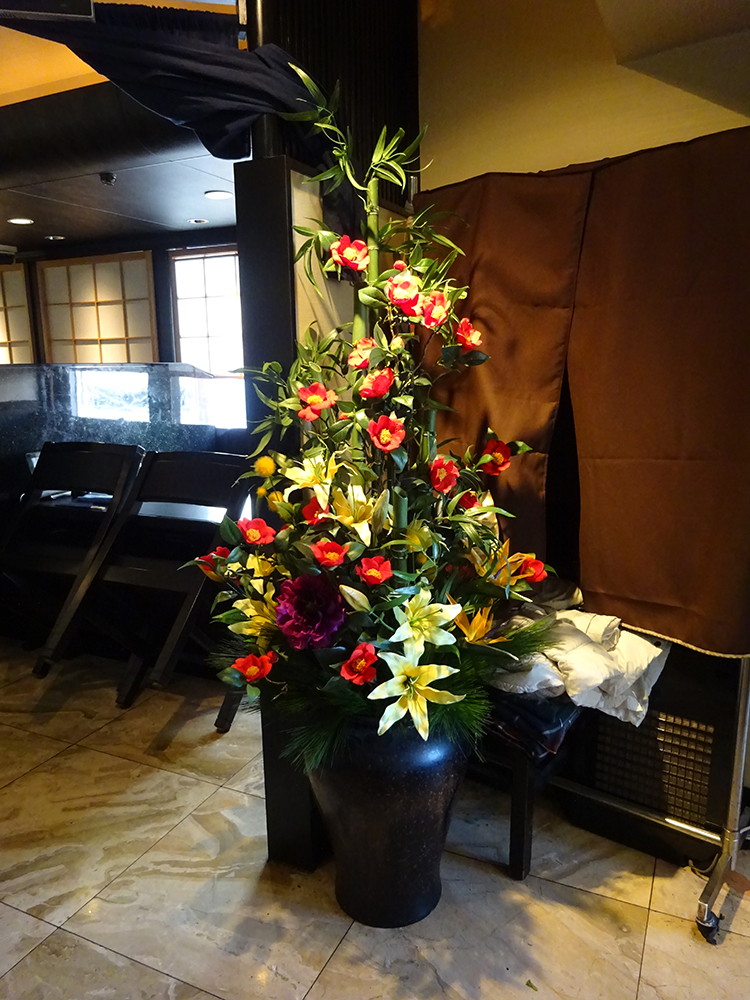 作品番号SET-365 設置場所 新宿 やきにく亭 六歌仙 サイズ(花器含む) オブジェ・大型 高さ180cm程度 主な花材 椿、ユリ、芍薬、竹、松 ※アレンジはすべてスタジオ理佳オリジナルデザインです。