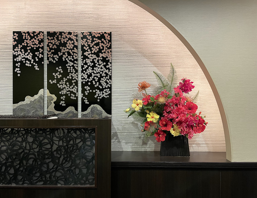 作品番号SET-373 設置場所 新宿 やきにく亭 六歌仙 サイズ(花器含む) LLサイズ 主な花材 ブーゲンビリア、ハイビスカス、ピンクッション、シダ ※アレンジはすべてスタジオ理佳オリジナルデザインです。