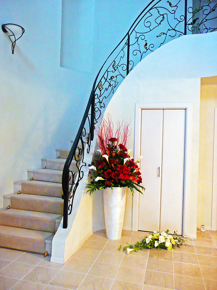 作品番号SET-418 設置場所 個人邸 エントランス サイズ(花器含む) オブジェ・大型 高さ180cm程度 主な花材 赤バラ、アマリリス、カラー、パームリーフ、枝 ※アレンジはすべてスタジオ理佳オリジナルデザインです。