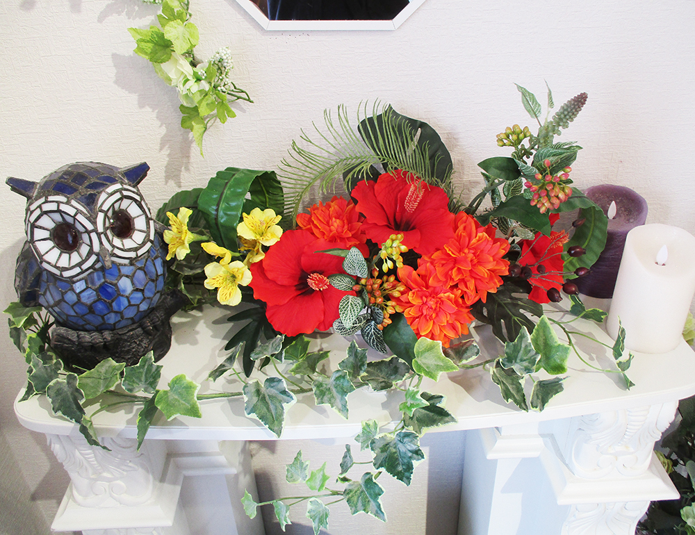 作品番号SET-421 設置場所 ネイルサロン エントランス サイズ(花器含む) Mサイズ 主な花材 ハイビスカス、ダリア、アルストロメリア、タニワタリ、シダ ※アレンジはすべてスタジオ理佳オリジナルデザインです。