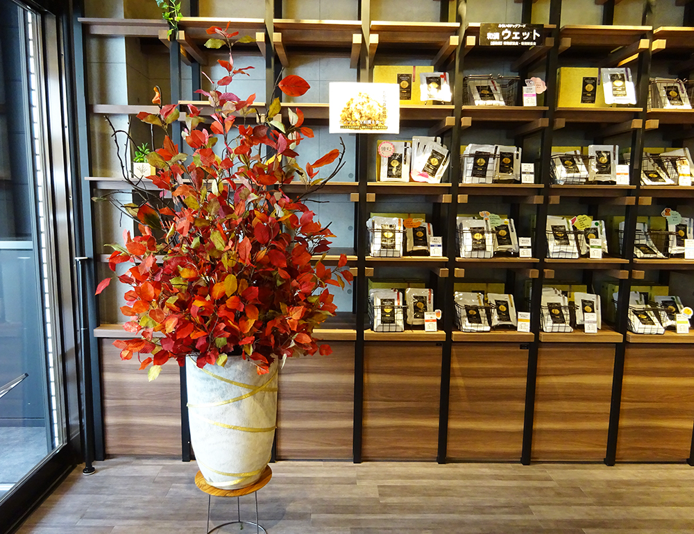 作品番号SET-427 設置場所 YAKUZEN GARDEN 自然の森製薬 サイズ(花器含む) オブジェ・大型 高さ160cm程度 主な花材 オータムバーチリーフ、秋葉 ※アレンジはすべてスタジオ理佳オリジナルデザインです。