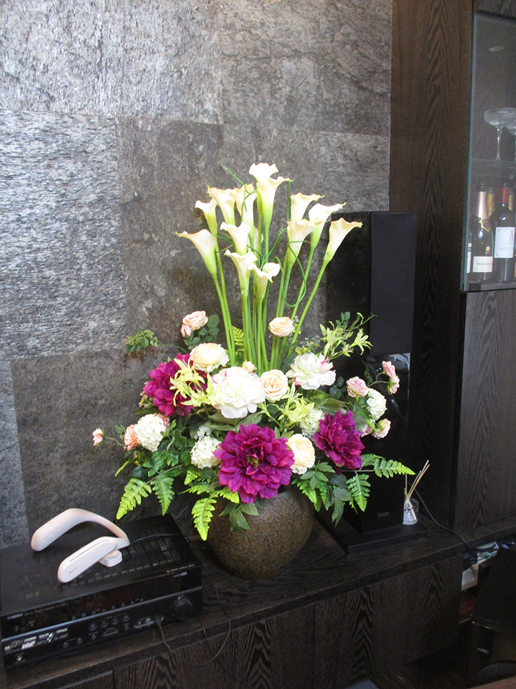 作品番号SET-436 設置場所 個人邸 リビング サイズ(花器含む) オブジェ・大型 高さ120cm程度 主な花材 カラー、ピオニーレザーファン ※アレンジはすべてスタジオ理佳オリジナルデザインです。