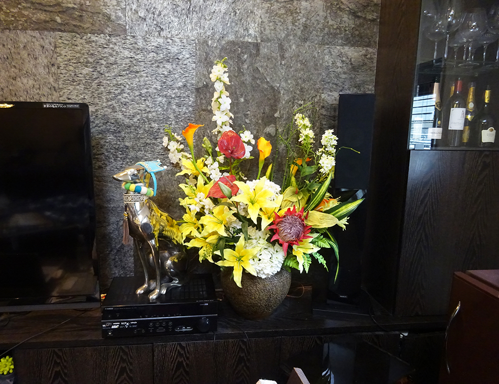 作品番号SET-439 設置場所 個人邸 リビング サイズ(花器含む) オブジェ・大型 高さ120cm程度 主な花材 ユリ、カラー、ハイドランジア、プロテア、アンスリウム、トクサ ※アレンジはすべてスタジオ理佳オリジナルデザインです。