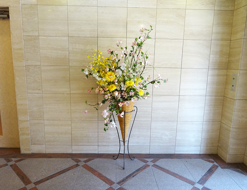作品番号SET-459 設置場所 横浜市 ビル エントランス サイズ(花器含む) オブジェ・大型 高さ180cm程度 主な花材 ハナミズキ、ガーベラ、オンシジューム ※アレンジはすべてスタジオ理佳オリジナルデザインです。