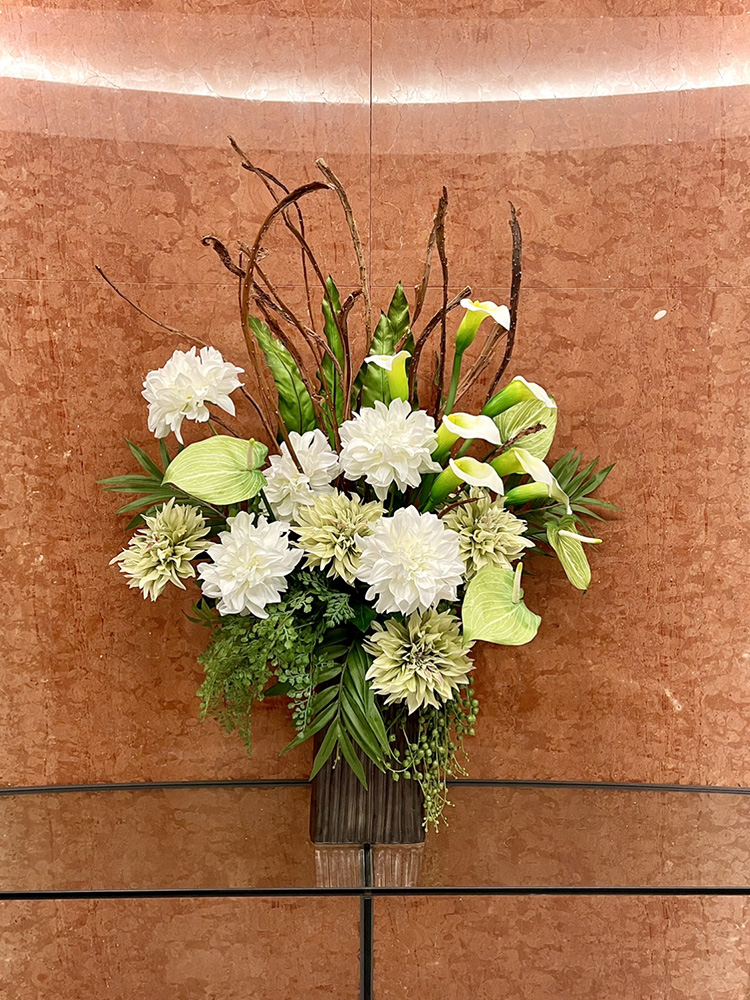 作品番号SET-463 設置場所 オフィス エントランス サイズ(花器含む) オブジェ・大型 高さ90cm程度 主な花材 ダリア、カラー、アンスリウム、タニワタリ、パームリーフ、石化柳 ※アレンジはすべてスタジオ理佳オリジナルデザインです。