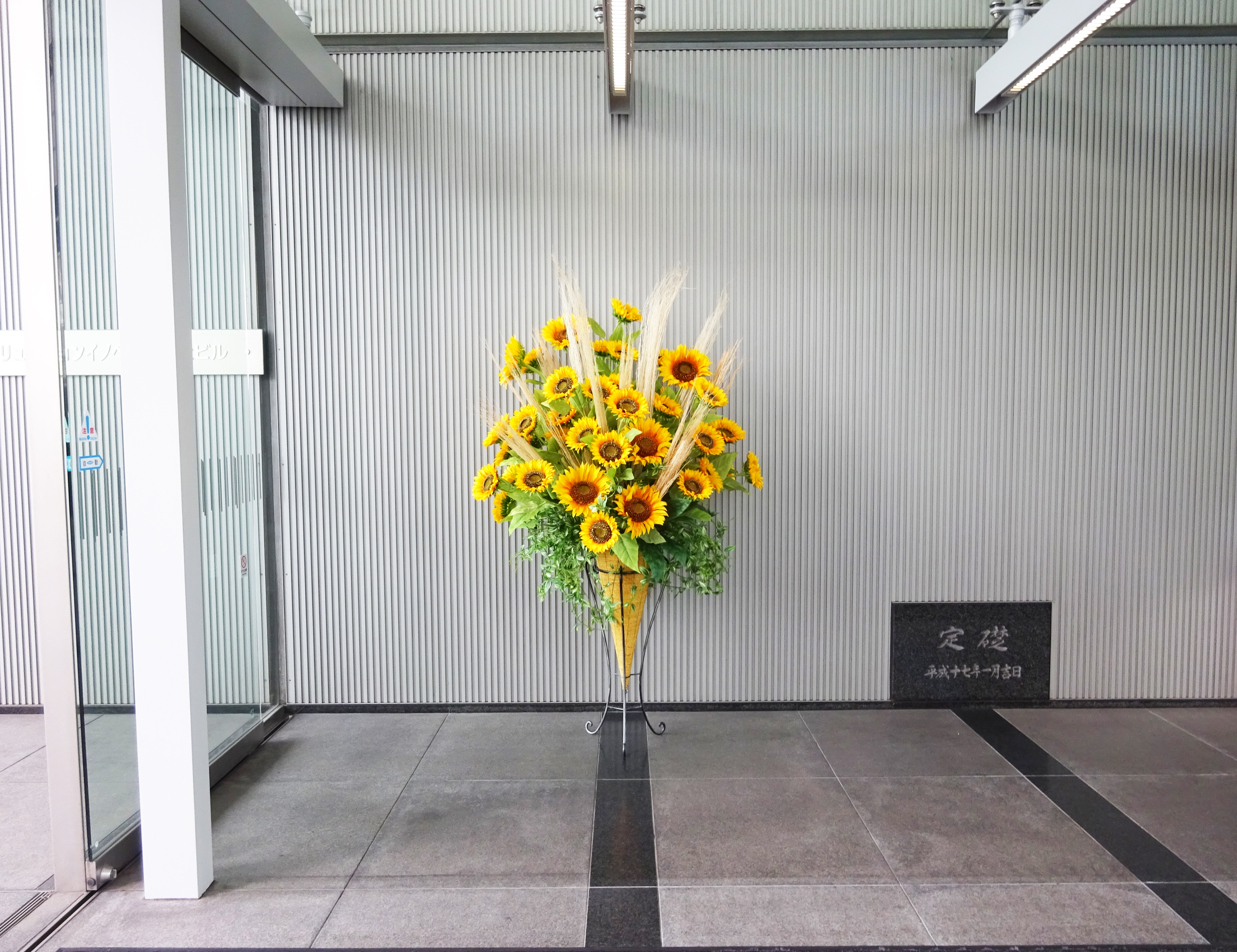 作品番号SET-470 設置場所 NECソリューションイノベータ株式会社 エントランス 風除室 サイズ(花器含む) オブジェ・大型 高さ2m程度 主な花材 ひまわり、ほうき草 ※アレンジはすべてスタジオ理佳オリジナルデザインです。