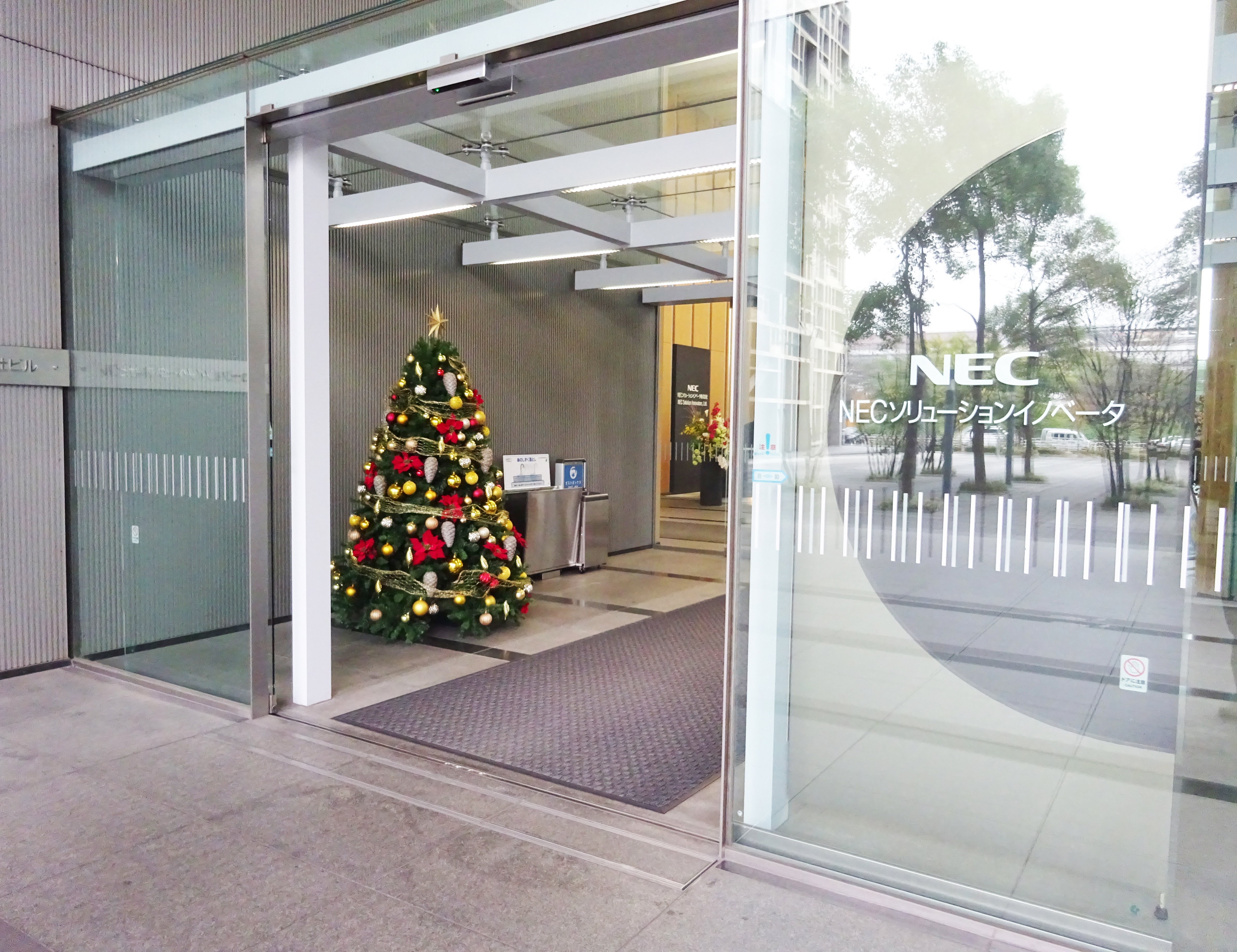 作品番号SET-472 設置場所 NECソリューションイノベータ株式会社 エントランス 風除室 サイズ(花器含む) オブジェ・大型 高さ2m程度 主な花材 クリスマスツリー ※アレンジはすべてスタジオ理佳オリジナルデザインです。