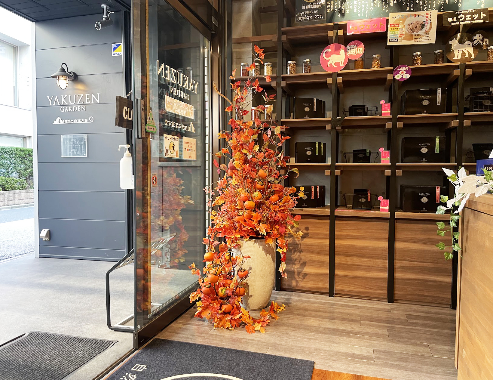 作品番号SET-485 設置場所 YAKUZEN GARDEN 自然の森製薬 サイズ(花器含む) オブジェ・大型 高さ170cm程度 主な花材 柿、メープルリーフ、秋葉 ※アレンジはすべてスタジオ理佳オリジナルデザインです。